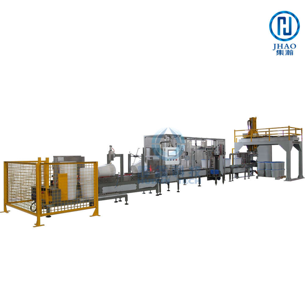 DCS30B2FJGFY-MD filling line can be adjusted to different filling height and it can move up and down automatically.It fits barrels in various shapes and the chain plate roller conveyanec makes filling safe and easy,automatic putting cap and automatic capping .two-speed filling is "fast and accurate"and filling stabitity is good. It can effectively improve filling speed,reduce wastage,save cost and alleviate worker's work load.